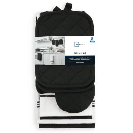 Mainstays Kitchen Towel, Dishcloth, Oven Mitt, and Pot Holder 8 Pack Set, Black, 100% Cotton, Black