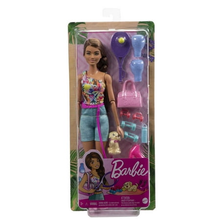 Barbie Self-Care Posable Doll, Brunette Workout Doll with Puppy and Accessories