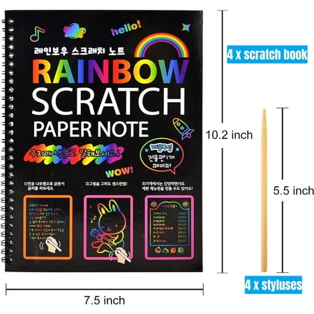 BSHAPPLUS? 4 Pack Rainbow Scratch Art Notebooks,Magic Scratch off Paper Notebook Set for Kids Art and Craft Activity Book Black Sketch Doodle Pads with Drawing Stick for Party Favor Game Gift