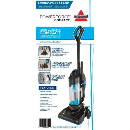 Keep your home spic and span with the BISSELL Power Force Compact Bagless Vacuum. It offers fast and easy cleaning in a lightweight, compact design. The BISSELL Power force compact vacuum delivers powerful suction for efficient clean-ups. The convenient cleaning machine requires no bags and has an easy-to-empty dirt cup. The see-through design of the BISSELL bagless vacuum also lets you tell when the cup needs to be emptied, while the compact design makes it easy to maneuver. It also takes up minimal space, so it's easier to store. Designed for modern homes, BISSELL Power Force Compact Bagless Vacuum is suitable for use on a variety of floor types from wood to tile, laminate, and more. Compact and maneuverable, the Power Force? Compact Vacuum weighs less than 8 pounds. Ideal for life's everyday clean-ups and hard-to-reach spaces. Powerful cleaning rotating brush and suction power system gives your home a thorough clean.