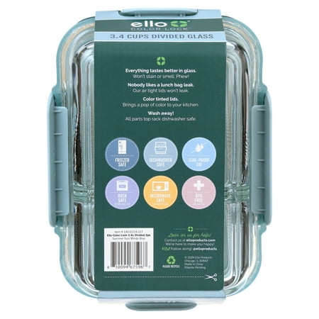 Make meal prep fun with the Ello Color Lock 2 pack, 3.4 cup/27.2oz glass container! Featuring leak-proof lids and divided sections, these containers make it easy to meal prep and control portions for a healthy diet. Perfect for prepping meals for the week, they help you stay ahead of your busy schedule. They are dishwasher, freezer, microwave, and oven safe up to 450?F without the lid. Made of non-porous glass, it won't absorb odors, flavors, or stains. Remember, avoid placing hot containers on wet or cold surfaces. Enjoy a fun and easy meal prep experience with Ello!