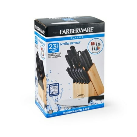 Farberware Classic 23 piece Never Needs Sharpening Dishwasher Safe Cutlery and Utensil Set includes all the necessary knives for everyday cutting jobs, plus essential tools for daily food-prep tasks. These sharp knives feature high-carbon stainless steel blades with a unique, wavy edge that never needs sharpening, and the durable black plastic handles are ergonomically designed for a comfortable grip. Set also includes plastic spatulas and measuring cups for mixing just the right amount of ingredients in all your favorite recipes. The 21-piece knife block includes an 8-inch chef knife, 6-inch slicing knife, 8-inch bread knife, 4-1/2-inch Santoku knife, 4-1/2-inch utility knife, 3-inch paring knife, six steak knives, all-purpose shears, and a natural pine block. The set includes a bonus 3-inch paring knife, mini shears, 5 colorful measuring spoons, and 2 spatulas. This Farberware cutlery set is dishwasher safe for easy cleanup and trouble-free maintenance.