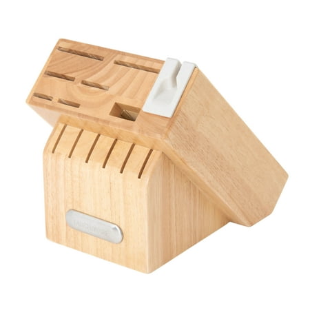 This Farberware Professional 14-Piece Forged Triple-Riveted Knife Block Set comes in a natural wood color and includes all the everyday essentials for food prep tasks. Knives feature high-carbon, stainless steel blades for strength and durability, with a razor-sharp edge for effortless cutting. Handles are ergonomically designed for a comfortable grip. All knives store neatly in the attractive wood storage block, which has a convenient sharpener built right in so you can sharpen blades any time. 14-piece set includes: an 8 inch chef knife, 8 inch slicing knife, 7 inch Santoku knife, 5 inch boning knife, 5 inch serrated utility knife, 3.5 inch paring knife, all-purpose shears, six 4.5 inch steak knives, and a storage block. Set is BPA-free. Handwash with warm water and a mild detergent; rinse and dry immediately. Lifetime Limited Warranty.