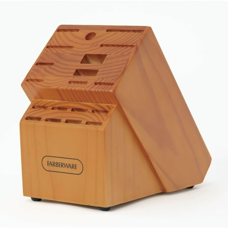 This 20-Piece Triple-Riveted Cutlery Set by Farberware includes: an 8 inch chef knife, 8 inch sharpening steel, 8 inch bread knife, 6 inch chef knife, 4.5 inch Santoku knife, 4 inch serrated utility knife, 4 inch fine-edge utility knife, 4 inch boning knife, 3 inch paring knife, (8) 4.5 inch steak knives, 2 kitchen shears, and a storage block. Each blade is expertly crafted from superior-quality, high-carbon stainless steel to retain sharpness and provide professional results. The ergonomically designed handles provide comfort, and the knives are perfectly balanced for precision while cutting. These essential everyday knives with black, triple-riveted accents add a sleek, modern look to your kitchen. Set is BPA-free. Handwash only. Lifetime Limited Warranty.