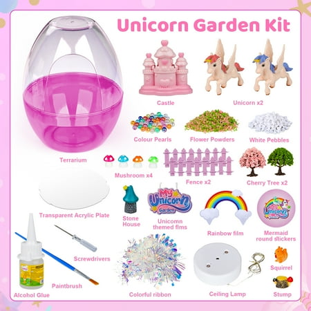 Light-Up Unicorn Terrarium Kit! Unicorn Art & Craft Gifts Unicorn Crafts for Kids Ages 3-12, children place unicorn castle, trees, mushrooms, etc. at random to enclose the lights into a fairy-tale miniature garden, and the unique fantasy DIY unicorn night light is complete! This specially crafted terrarium is designed to ignite a child's imagination and create a magical unicorn habitat that mimics nature. Craft kit for girls aged 3-12 years old, kids Toy Unicorn Craft Kits make great gifts for girls for birthdays, Christmas, Easter and Halloween.