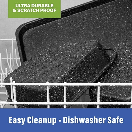 Step up your baking game with the Granitestone Diamond 6 Piece Bakeware Set, featured in an elegant speckled black finish. This stackable kitchenware set elevates your baking experience with its premium construction, including essential items like a roaster pan, cookie sheet, and square baking pan, all engineered with a mineral and diamond-infused nonstick coating. The robust aluminum build ensures even heat distribution for perfectly baked treats, from muffins and cakes to hearty lasagnas. Its stackable design is not only space-saving but also dishwasher safe, combining convenience with durability for everyday use. Ideal for both new bakers and seasoned chefs, this set withstands the rigors of frequent baking, maintaining a professional look thanks to its scratch-proof surface.