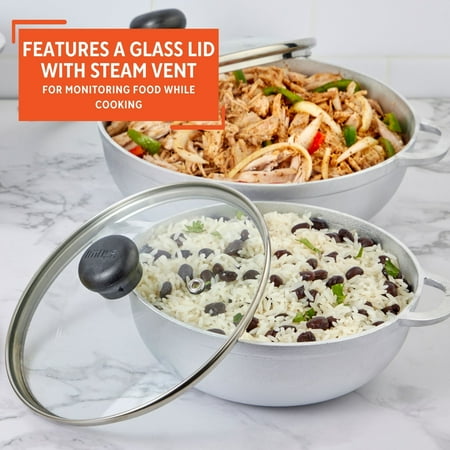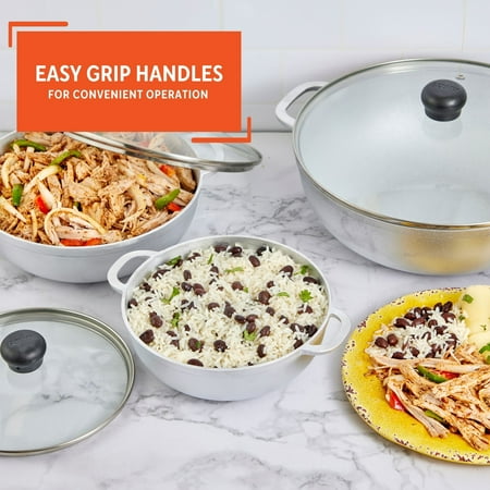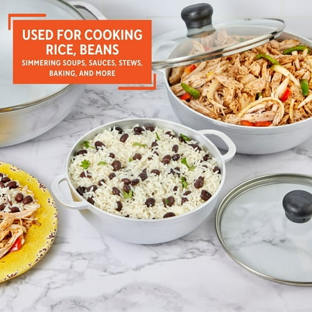 Introducing the IMUSA Basic Caldero Set, a versatile kitchen essential crafted from durable cast aluminum. With a natural finish cooking surface that seasons over time, this set promises even heat distribution and is oven safe without the lid. The easy-grip handles ensure convenient handling, while the tight-fitting glass lid, equipped with a steam vent, enhances cooking precision. Ideal for a wide range of culinary applications, from cooking rice to simmering soups, beans, sauces, stews, and even baking, this caldero set is a must-have for everyday use. Tailored especially for Hispanic recipes, the IMUSA Basic Caldero Set combines traditional charm with modern functionality, making it the perfect companion for your diverse cooking needs.