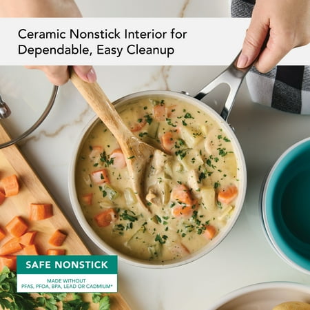 This 10 piece nonstick cookware set combines durable forged construction and a fast, even-heating base with a modern-colored ceramic finish for beautiful kitchen-to-table presentations. The high-quality ceramic nonstick interiors - made without PFAS, PFOA, PTFE, lead, or cadmium* - allow for consistent food release and easy cleanup.