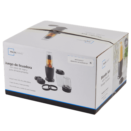 Mainstays 10-Piece Blender Set, Black, 300W, with 3 Jars (10oz, 16oz, 18oz), 2 Drinking Lids, Stainless Steel Blade