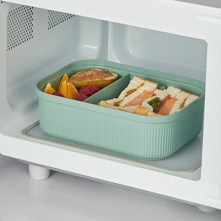 Mainstays rectangle container with utensil fit for lunch size. Its stackable design could help well organize your space. The container is airtight with silicone seal ring design. Bento box with transparent lid and green color container which allow goods view easily inside. The utensil could be fit into the lid so you will never worry where to put them. The utensil could be used as spoon as well as fork. Convenience simple lid with locks design, east to lock and unlock the container. Multi color available for your choice, BPA free material and top rack dishwasher safe.