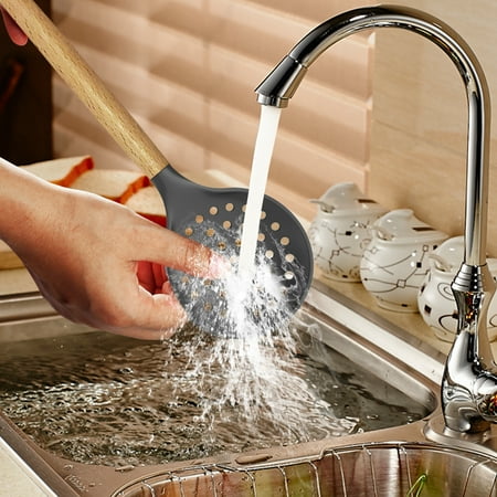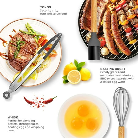 WHAT DOES THE 14-PIECE SILICONE COOKING UTENSILS SET INCLUDE? Deep Soup Ladle; Solid Serving Spoon; Slotted Spoon / Strainer; Slotted Turner; Pasta Server; Flexible Spatula; Basting Brush; Whisk; Tongs; Round Spatula; Turner; Large Skimmer Spoon; Small Silicone Spatula; Utensils Holder SOFT YET STURDY GRAY SILICONE KITCHEN UTENSILS IS DEFINITELY THE BEST COOKING COMPANION FOR NONSTICK COOKWARE Please Note: (1) When using these cooking utensils for the first time, you must soak them for half an hour, and then expose them to the air for about 3 hours. The original smell of silica gel will disappear (2) There is a slight color difference between the shooting of the image and the product itself (3) Due to the different measurement methods and tools, there are errors in the size of the product and the product itself
