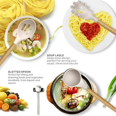 1: The silicone cooking utensil set BPA Free, food grade silicone, does not React with Food or Beverages 2: No warping, no breaking, soft, kitchen utensils for nonstick cookware 3: The kitchen tools which one piece design with stainless steel core 4: 446?F heat resistant Wooden handle kitchen utensils for cooking,baking,mixing.14 pieces of kitchen utensils to fully meet the needs of the kitchen 5: The wooden handle is smooth and comfortable to hold, preventing heat transfer and preventing hot hands 6: Easy to clean, not recommended for dishwasher 7: Quick after-sales response (within 12 hours) LIST OF PRODUCTS YOU WILL GET: Deep Soup Ladle / Solid Serving Spoon Slotted Spoon / Slotted Turner Turner / Food Tongs Pasta Server / Flexible Spatula Basting Brush / Whisk Round Spatula Turner / Large Skimmer Spoon Small Silicone Spatula / Utensil Holder Please Note: 1: When using these cooking utensils for the first time, you must soak them for half an hour, and then expose them to the air for about 3 hours. The original smell of silica gel will disappear 2: There is a slight color difference between the shooting of the image and the product itself 3: Due to the different measurement methods and tools, there are errors in the size of the product and the product itself