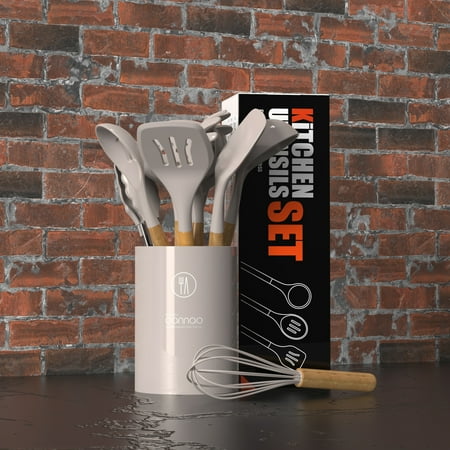 oannao Silicone Cooking Utensils Set - 446?F Heat Resistant Silicone Kitchen Utensils for Cooking,Kitchen Utensil Spatula Set w Wooden Handles,Holder, BPA FREE Gadgets for Non-Stick Cookware (Khaki), Beige
