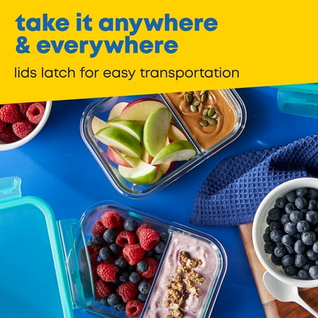 This meal prep container is designed especially for making meals ahead, to help organize lunches. With two compartments, you can keep foods separate, perfectly made up and ready to go. These durable glass storage containers have tight-fitting lids to keep food fresh. And the pure Pyrex? glass stands up to the microwave and dishwasher use after use.