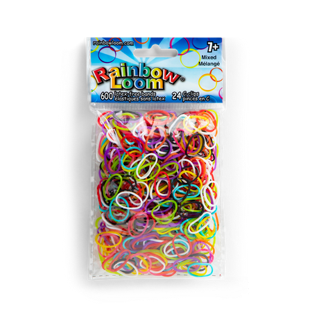 Mix of solid colored latex free rubber bands for Rainbow Loom Rubber Band Looms. Includes: 600+ rubber bands & 24 C-clips. Makes up to 24 rubber band bracelets.