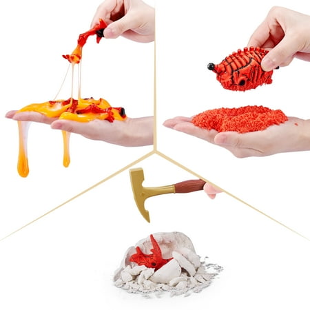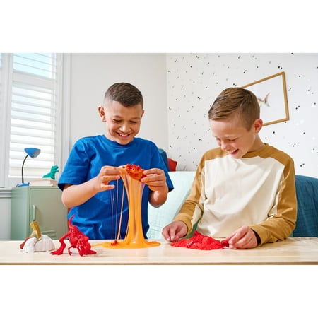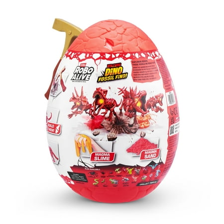 Turn up the heat with Robo Alive Volcano Dino Fossil Find. Dig through volcanic rock, sand, and slime using the excavation tool to find 1 of 4 magma dinosaur fossils. Have you discovered the fearsome T-Rex, terrifying Triceratops, awesome Ankylosaurus or the striking Stegosaurus? Assemble the fossil pieces to bring your dinosaur skeleton to life with lights and sounds! With a light up magma look and realistic dinosaur roar, these Dino fossils are like nothing you've seen before. It's more than alive - It's Robo Alive.