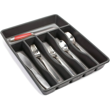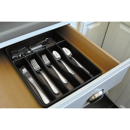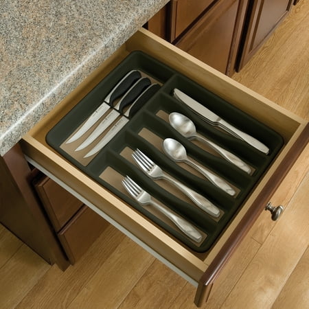 Achieve a neat and organized space for improved efficiency with this Rubbermaid Large Silverware Organizer. It's made of sturdy plastic. This kitchen utensil tray features six different compartments separated by a raised divider. It also has a non-slip bottom that keeps it firmly in place. It also helps to protect your drawers from excessive wear and tear. This Rubbermaid Large Silverware Organizer has a grey design for a clean look and added style. You can use it to store various size forks and spoons, as well as knives and extra utensils. It's dishwasher safe for easy care. It offers a practical solution for safe and effective storage.