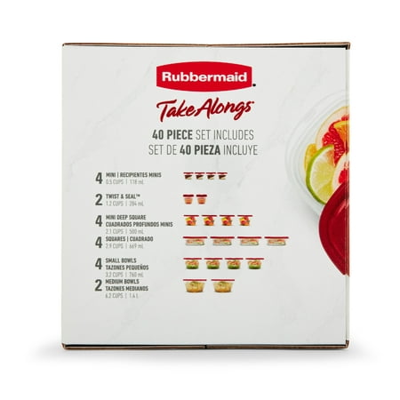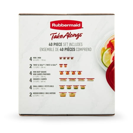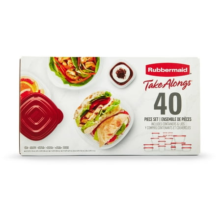 Store, organize and pack a variety of foods with these Rubbermaid Take Along Containers. Ideal for meal prep, lunch, snacks, leftovers and more, they have updated, more durable bright-red lids, while the ridged design makes stacking easy. This Rubbermaid 40 piece storage set is also BPA-free, freezer and top-rack dishwasher safe and the bases are microwave safe for reheating, making them a wonderful choice for taking to work, school, the office, on picnics and to just store food in your fridge or freezer as well. The thick walls make them ideal for everyday use and when you stack them they take up less space in your cabinets. Rubbermaid Take Along Containers keep your food fresh and prevent leaks and are ready to reheat and store your favorite foods.