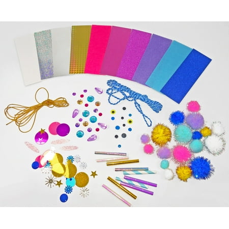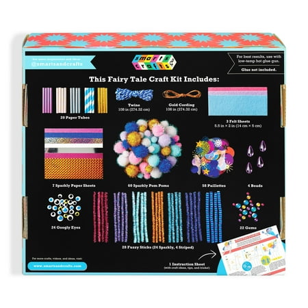 The Smarts & Crafts Fairy Tale Craft Kit includes everything you need for mystical making! This curated collection of supplies is the foundation for an enchanted crafting session and includes everything from pastel pom-poms to a treasure trove of shimmering gem stones. This kit also includes step-by-step instructions that show you how to create a fluttering fairy, a playful prince, a prancing Pegasus, and a magical mermaid. Try to recreate a character or scene from your favorite fairy tale, or imagine a new one! Do your characters live in a castle in the clouds or a grotto hidden deep under the sea? Let your creations inspire a story that you can write and illustrate. For children ages 6+. Unisex. This kit does not include glue.