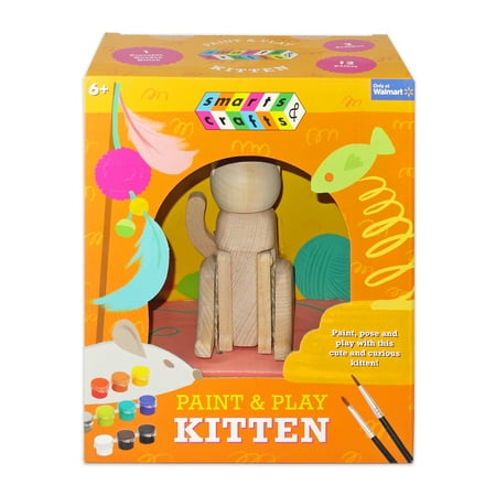 Smarts & Crafts Paint and Play Kitten includes a poseable, paintable wooden figure of a kitten whose front legs, head, and tail move! Customize your kitten using the 12 vibrant paints and 2 paint brushes, designed for creating luminous eyes, fabulous fur and purrfect paws. When you?re done designing and ready to play, imagine the adventures your kitten has during the day! Do they explore the neighborhood as an outdoor cat, or do they prefer to stay warm and cozy curled up at home? For children ages 6 and up. Unisex.