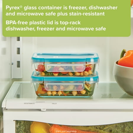 Pyrex glass container resists stains and does not absorb food odors or flavors. Airtight leak-proof lid has 4 locking tabs and is BPA-free. Container and lid are dishwasher, freezer and microwave safe. Built-in write and erase label on lid. Limited lifetime warranty.