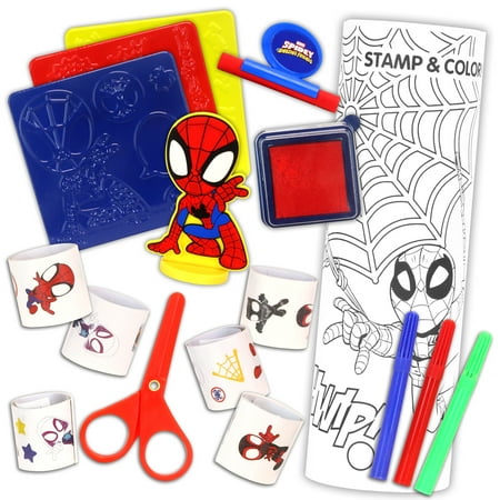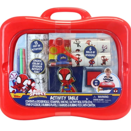 Spidey & Friends plastic activity table provides your child with tons of creative activity fun. This table has everything you need to start creating! It is filled with a 15 foot perforated activity paper roll to color, sticker and stamp. Also features rubbing plates, stickers, scissors and markers. Legs fold out when in use and back when not for easy storage. Built in carrying handle makes it great to take along anywhere! The drawing surface also doubles as a storage area for easy clean up fun!