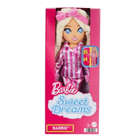 It's time for a slumber party with Sweet Dreams Barbie plush dolls! Standing almost 14 inches tall for tiny hands, each soft doll wears its own unique pajama set showcasing an adorable sense of style. While the fashions are non-removable to avoid small pieces, the mixed fabrics and 3D details add charm and tactile feel. Bring these endearing plush dolls into a bedtime routine for sweeter dreams for kids 2 years and older. Each sold separately, subject to availability. Colors and decorations may vary.