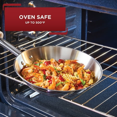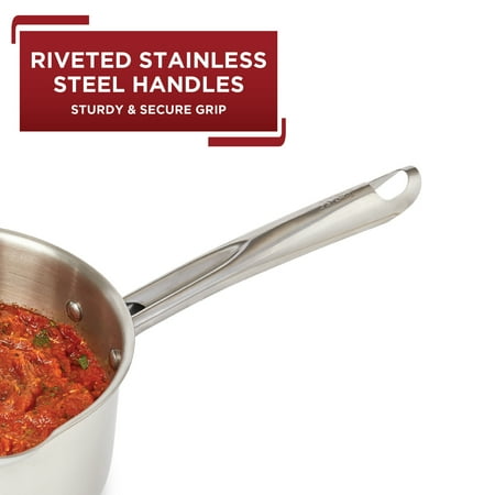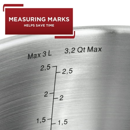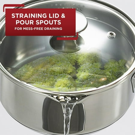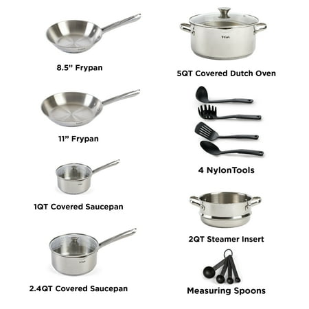 Extra convenience for everyday cooking with T-fal Cook & Strain Stainless Steel 14-Piece Set. Convenient features like straining lids, pour spouts, measuring marks and riveted Stainless Steel handles make cooking a breeze. Includes 8? frypan, 10.5? frypan, 1qt covered saucepan, 2.4qt covered saucepan, 5qt covered Dutch oven, 4 Nylon tools, measuring spoons, and 2qt steamer insert. Stainless steel construction ensures long lasting performance, and the Stainless Steel interior maintains the purity of flavor. Even heat Induction base ensures no hot spots. Dishwasher and oven safe up to 500?F; compatible with all cook tops, including Induction.