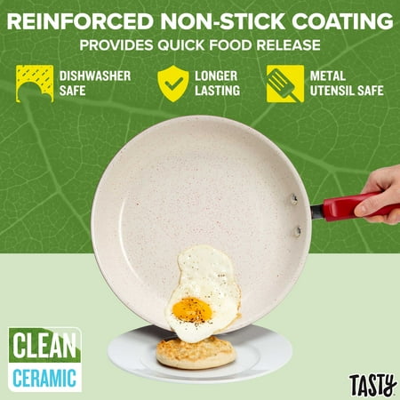 The Tasty Clean Ceramic non-stick 24 piece cookware set that includes everything you need and then some. The better, stronger, longer-lasting reinforced speckled Clean Ceramic non-stick coating allows food to easily slide out of the pan. Our speckled non-stick coating is made without PFAS, PFOA, PTFE and PFOS to bring you the same Tasty cookware you love??? elevated for healthy cooking. The heavy duty construction on the cookware set heats quickly and evenly so you can cook with ease. The wok and cookware with stainless steel base are suitable for all cooking surfaces, including induction, electric, gas and glass.